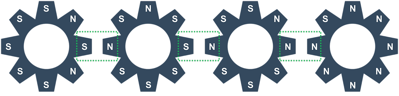 두 톱니바퀴의 맞닿은 부분은 초록색 점선으로 묶여있는 부분이다. 여기서, 3번 톱니바퀴를 반시계 방향으로 회전했다면, 4번 톱니바퀴는 시계 방향으로 회전하게 된다. 2번 톱니바퀴는 맞닿은 부분이 S극으로 서로 같기 때문에, 회전하지 않게 되고, 1번 톱니바퀴는 2번이 회전하지 않았기 때문에, 회전하지 않게 된다. 따라서, 아래 그림과 같은 모양을 만들게 된다.